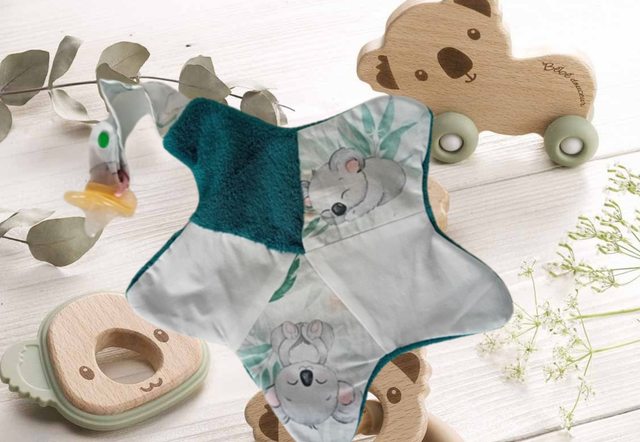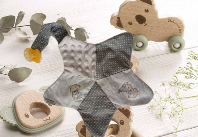 Un joli doudou souple et moelleux que votre bébé emmènera partout avec lui. Adapté à ses petites mains, en forme d'étoile et une languette au sommet pour accrocher la tétine ou attacher à la poussette et éviter de le perdre.