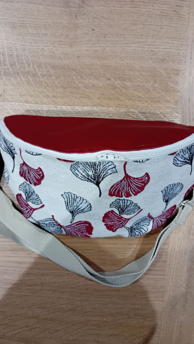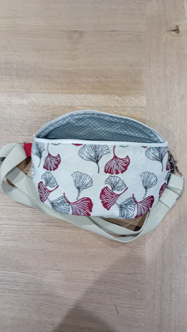 Sac banane doublé en coton gris géométrique, l'extérieur est en tissu épais beige et bordeaux et rabat en similicuir bordeaux de qualité supérieure.